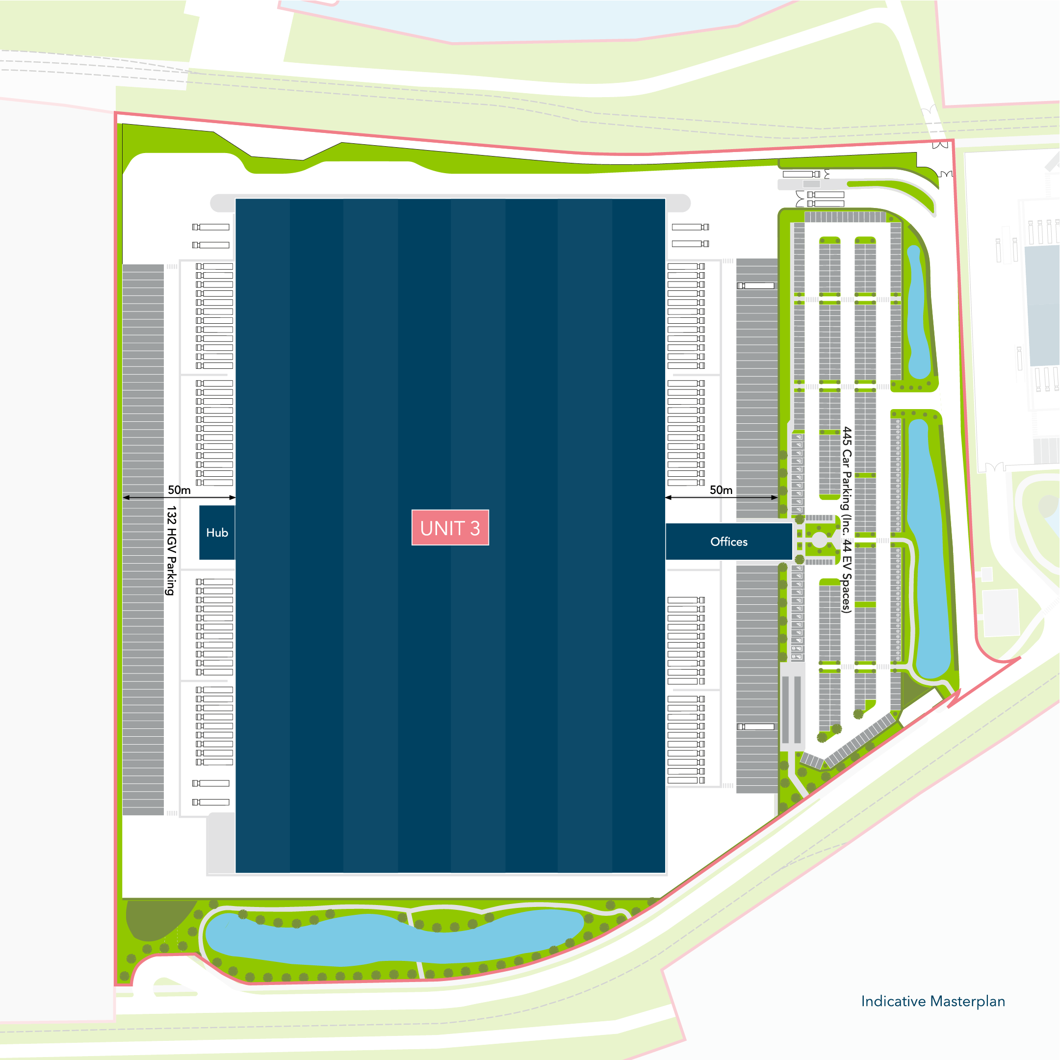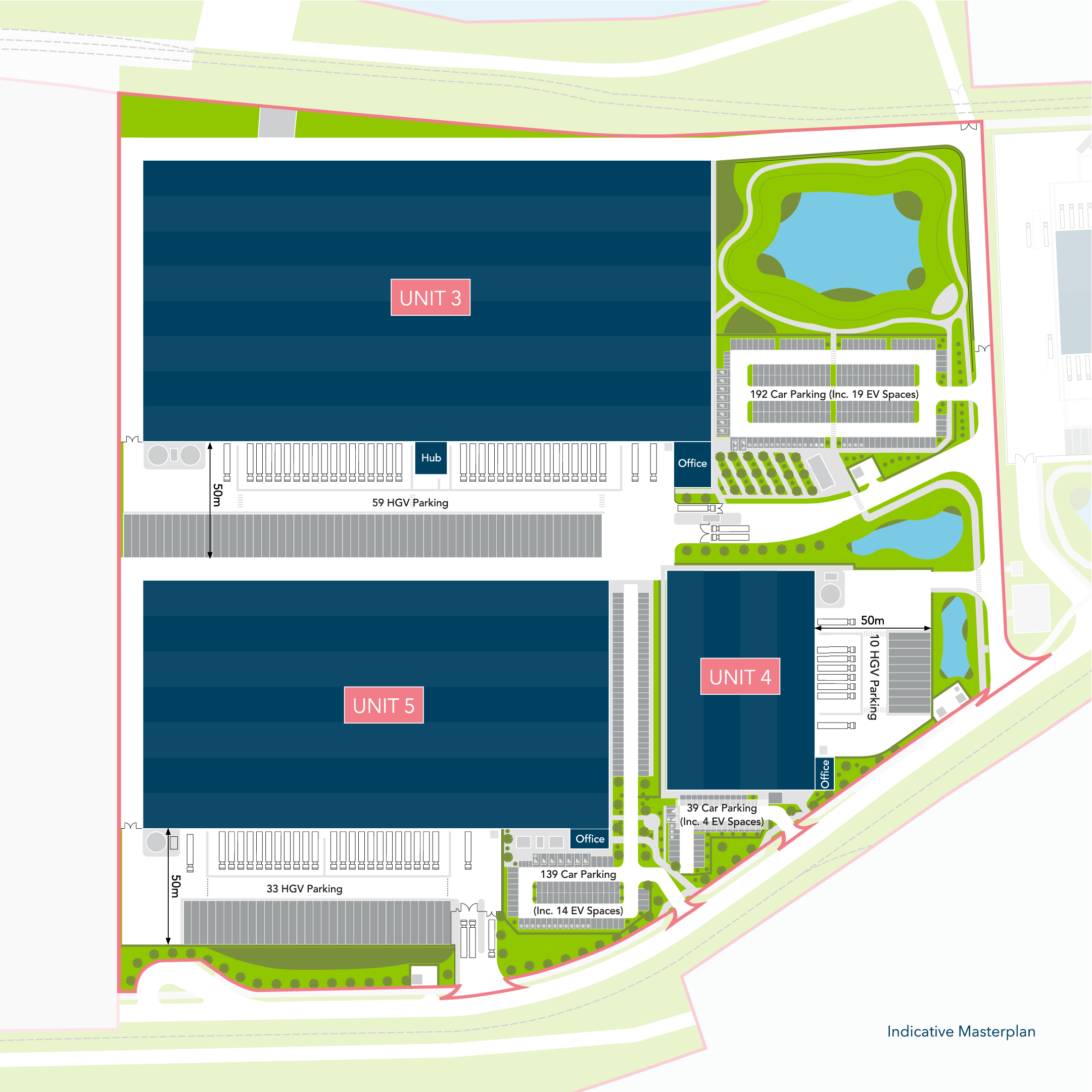 Site infrastructure and enabling works are underway to create a vertical ready central development plot for summer 2026. At the same time, two Reserved Matters Applications have been submitted for this plot: a single cross-dock logistics facility of 640,000 sq ft and a 3-unit scheme ranging between 70,000 sq fr and 330,000 sq ft. Toggle between the masterplan inset to view both layouts. These RMA’s will be determined in Q1 2026 providing customers with a range of building sizes to choose from to commence vertical construction as soon as enabling works are complete.